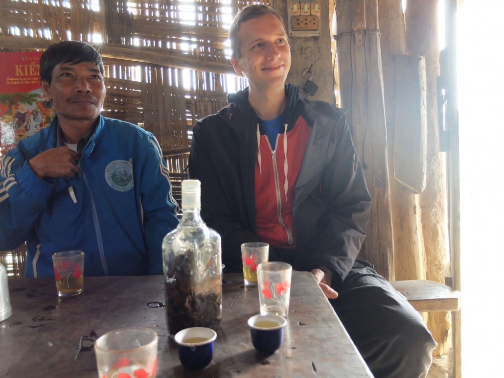 Mittagessen gab es in dem kleinen Dorf einer vietnamesischen Minderheit. Die Bergnomaden ernähren sich eigentlich vom Wanderfeldbau, was der Regierung jedoch so gar nicht gefällt, weshalb sie sie zunehmend zwingt sesshaft zu werden. Die meisten leben in einfachen Bambushütten unter sehr armen Verhältnissen. Das hielt die Bewohner jedoch nicht davon ab, uns zu einem Hornissenschnaps einzuladen. Nicht nur das Gebräu an sich war eine Herausforderung, auch die trüben Gläser ließen uns noch schnell eines unserer Abwehrkräftegebete sprechen. Da uns dieses Problem nach dem ersten Gläschen aber nicht mehr so relevant erschien, tranken wir gerne noch ein zweites Ründchen mit. An und Ly versicherten uns, dass ihnen das Getränk immer bestens gegen Rückemschmerzen hilft. Also dann, hoch die Gläser. Nachdem wir allesamt beschwipst waren, gings mit bester Laune wieder aufs Moped, geradewegs dem Sonnenuntergang am Lake Lac entgegen.