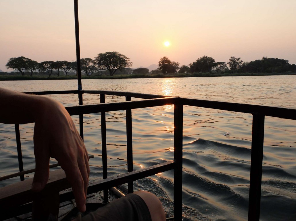 Unser Guesthaus war ein Hausboot auf Pontons und das ruhige Eckzimmer mit Balkon gefiel uns so gut, dass wir unseren Aufenthalt immer wieder verlängerten – bei sanftem Wellengang genossen wir täglich den Sonnenuntergang und schauten in die Strömung – mit einem kühlen Bier in der einen Hand und ein paar Pistazien in der anderen. Wir konnten uns nicht daran erinnern, in letzer Zweit so fest geschlafen zu haben, wie im blütenweißen, weichen Bett auf dem schunkelden River Kwai.