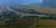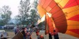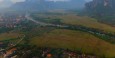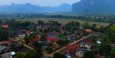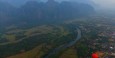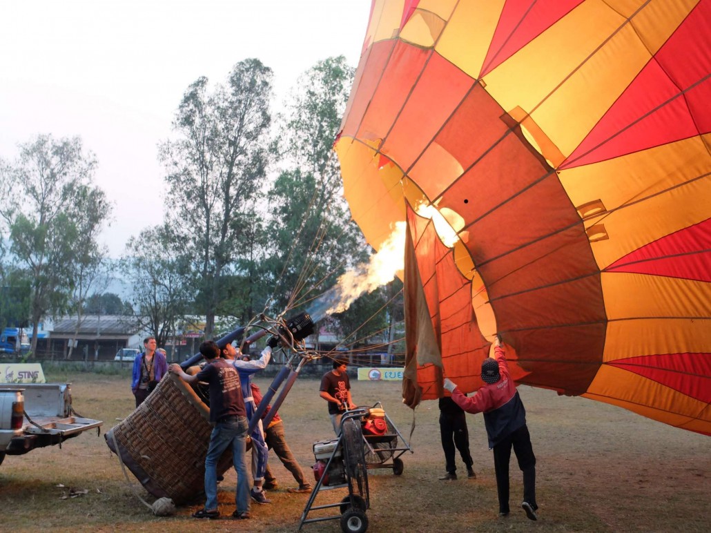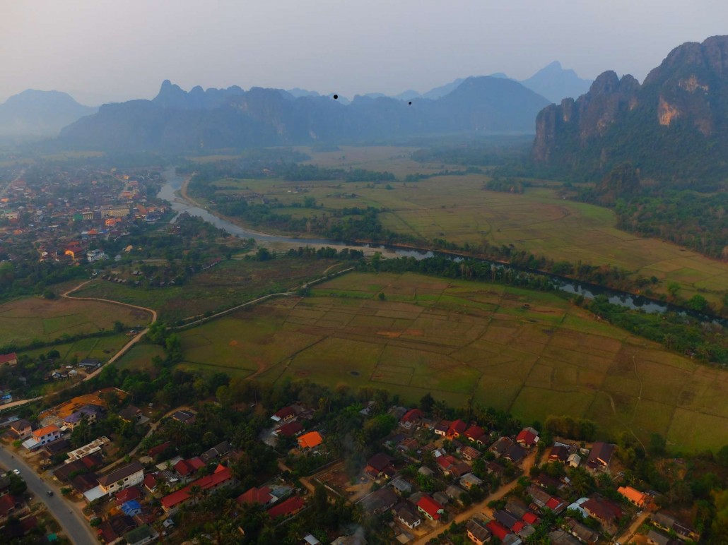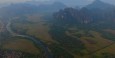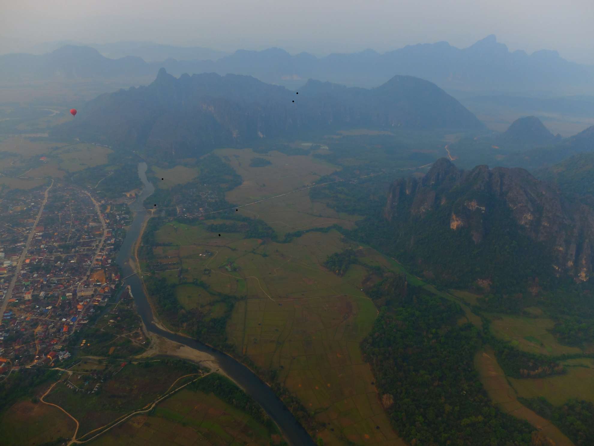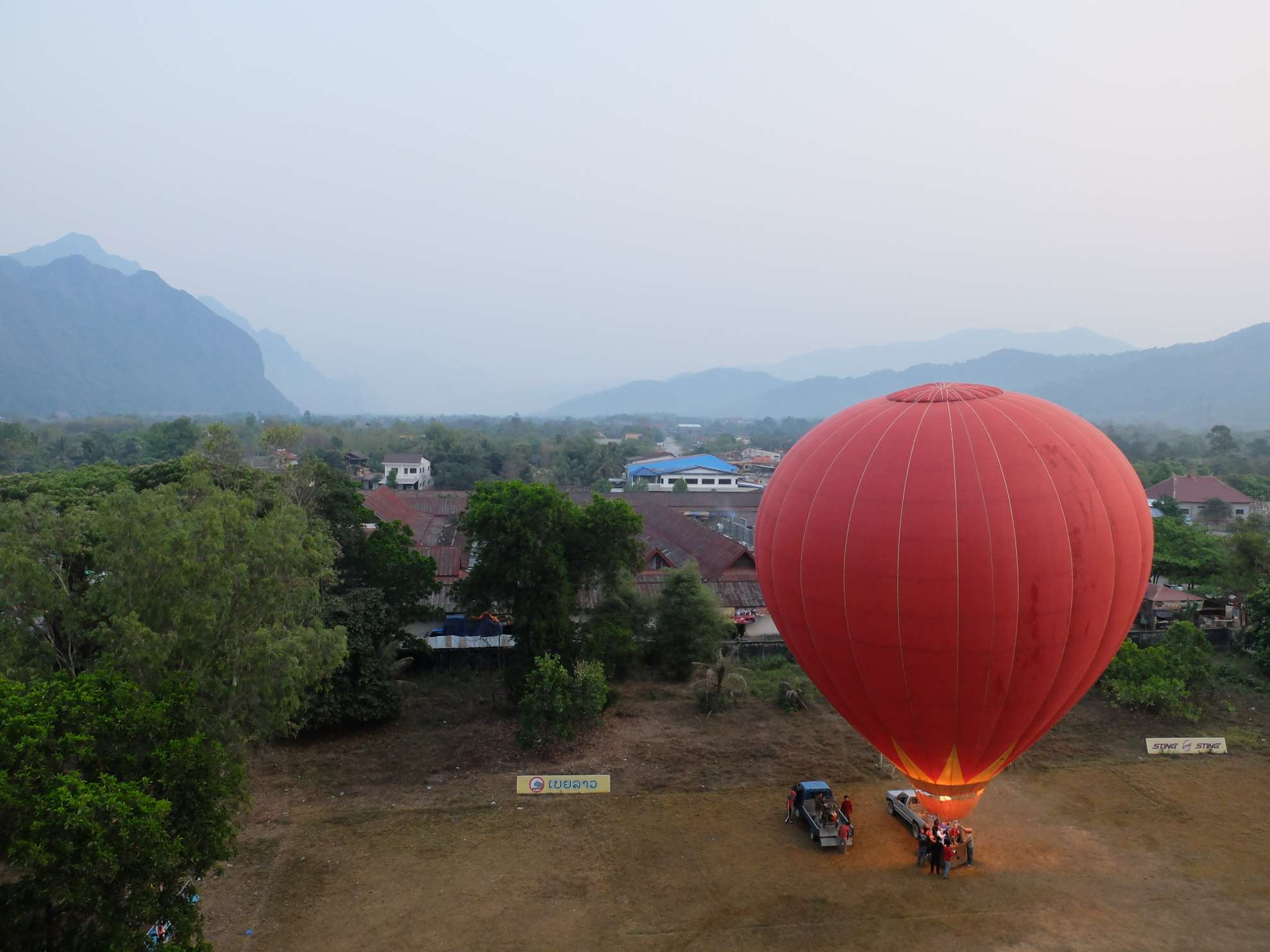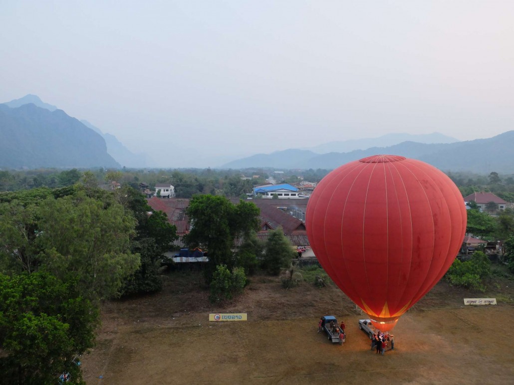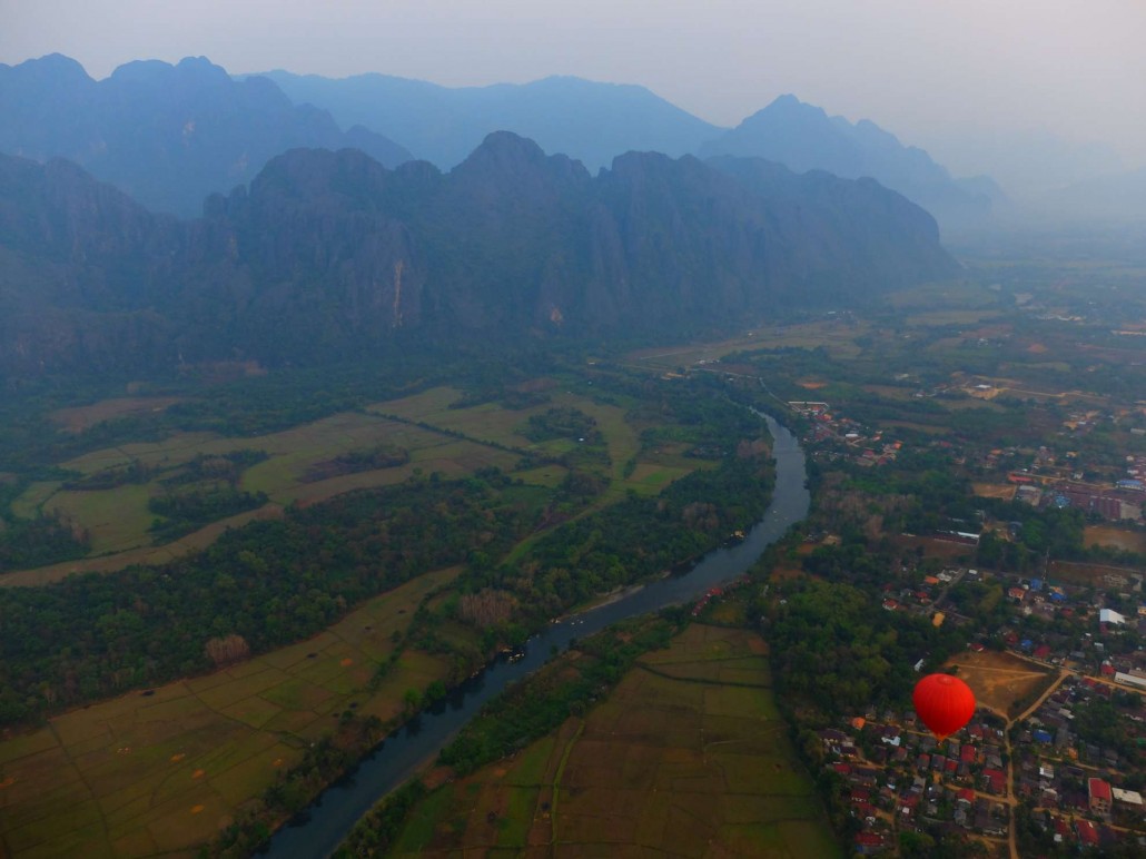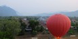 Unser Highlight war eine Fahrt mit dem Heißluftballon. Die Fahrt startete Morgens um 5:30Uhr. Die chinesische Crew war ausgesprochen unaufgeregt – ohne das ein Wort fiel, wurden zwei Ballone angefeuert, wir stiegen in den Korb und los gings. Zunächst gleiteten wir im Tiefflug über die Stadt und dann in luftiger Höhe in die entgegengesetzte Richtung immer den Fluss entlang. Etwas mulmig war uns schon, aber der Pilot schien sein Handwerk zu verstehen und viel zu erklären gab es eh nicht. Und siehe da: die Schönheit Vang Viengs liegt nicht unterm Tresen sondern in stiller luftiger Höhe – aber seht selbst: