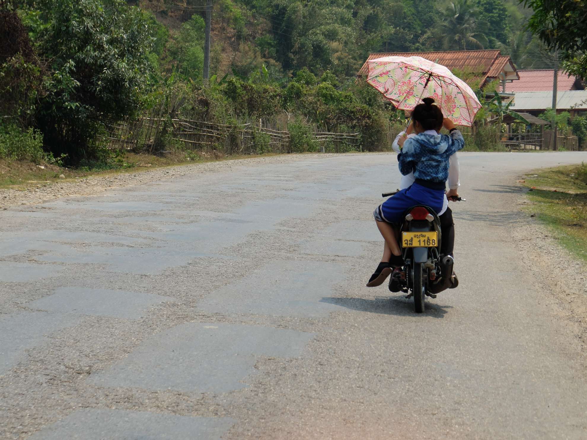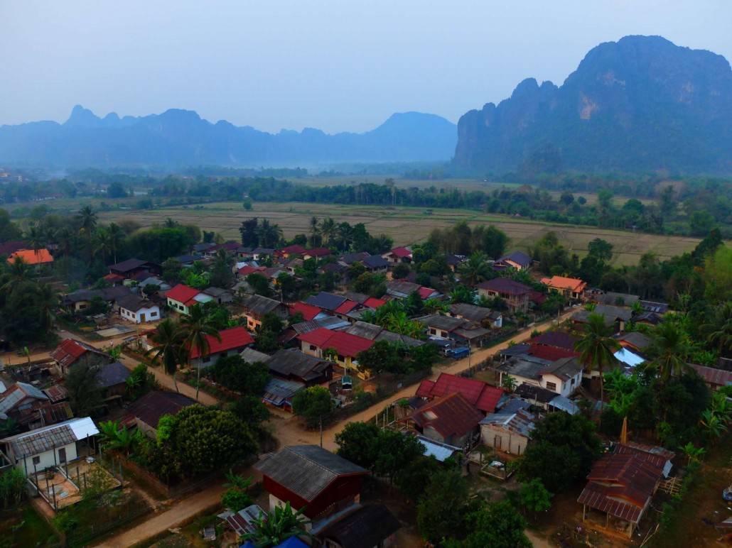 Unsere Weiterreise nach Vang Vieng verlief anders als gedacht. In der Regel hat man die Wahl zwischen einem privaten Minibus, den man sich mit anderen Touristen teilt und dem normalen öffentlichen Bus. Wir entschieden uns meist für den öffentlichen Bus, weil es einfach interessanter ist und man auch mehr Platz hat. Vor der Abreise erkundigten wir uns noch: „Big Bus? Aircondition?“ – die Antwort war wie immer: „Yes!“, also, alles klar, wie auf dem Ticket vermerkt. Das Ende vom Lied, ihr könnt es euch schon denken: Da sich nur zwölf Reisende einfanden – und das nur zwei Personen mehr sind, als in einen Minibus passen – fuhren wir alle mit dem Minibus. Das Gute an der Sache, wenn man so Knie über Knie zusammensitzt: man kommt schnell in Gespräch. Zumal wenn man die einzigen beiden Ausländer ist, äh sind, oder so, ist ja auch egal. Wir kamen in den Genuss der ausführlichen Fotoreportage der lokalen Traumhochzeit vom Wochenende und zur Erinnerung wurde uns stolz eines der beeindruckenden Fotos zugesteckt. Nach ungefähr drei Kilometern hielten wir auf Drängen der Mitreisenden zum ersten mal in einem kleinen Dorf und wir wurden mit Bonbons und Limonade beschenkt und später sogar zum Mittagessen eingeladen. Toll. Wer hätte das gedacht, als unser Gepäck an diesem regnerischen Tag unter unseren kritischen Blicken auf dem Dach des Minibusses verschnürt wurde.