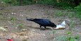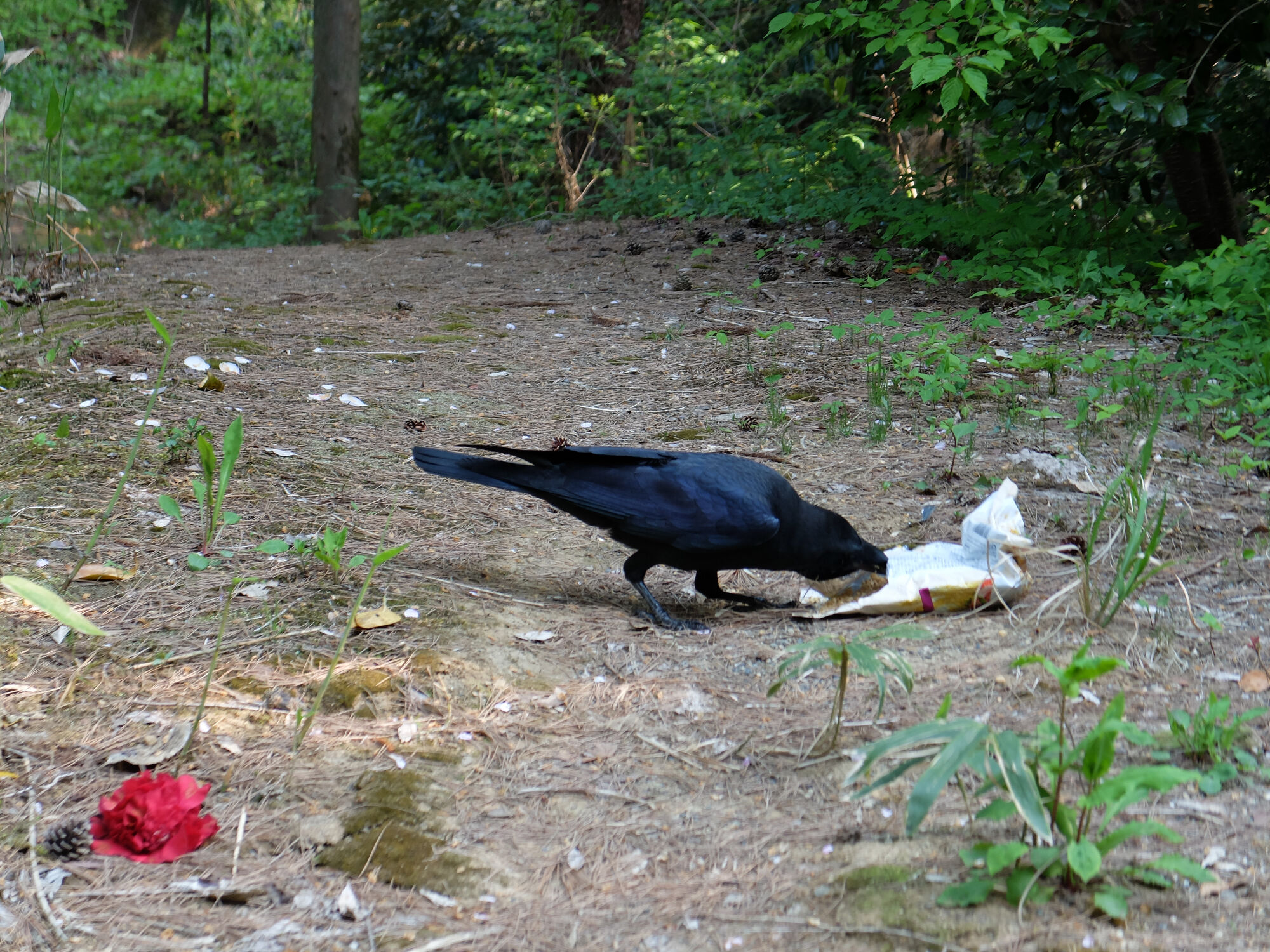 In Yahiko, Tsubame, waren wir auf unserem Zeltplatz das erste mal nicht alleine. Drei ältere Herren, die sich noch aus der Pfadfinderzeit kannten, hatten hier ebenfalls ihr Lager aufgeschlagen. Wir freuten uns an der Gesellschaft, die uns letztlich eine Krähe bescherte. Als die heiteren Herren ihr Mahl fast fertig gegrillt, gegart bzw. gekocht hatten, bemerkten sie in der Nähe die schönen Kirschblüten und waren für einen kurzen Moment weg. Währenddessen stürzte eine riesige Krähe auf ihren gedeckten Tisch, nahm sich ein Stück Fleisch und flog zur nächsten Mauer. Wir sprangen auf, riefen und wedelten mit den Armen und so nahm der Abend seinen Lauf. Sie überhäuften uns mit Geschenken und wir plauderten. Diesmal gab es köstlichen Knoblauch-Sake (zum Probieren), normalen Sake (eine Flasche), Brot (ein Laib) und Kuchen sowie Kaffee aus Mini-Filtertüten. Die Krähe mochte lieber Müsli. Dabei wußte sie, was in der Verpackung ist. Sie nahm am nächsten Morgen den vollen, ungeöffneten Karton im Vorbeiflug mit. Carmen spürte später im Wald die Krähe samt Beute auf und entsorgte sie fachgerecht. Die Verpackung.