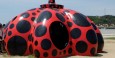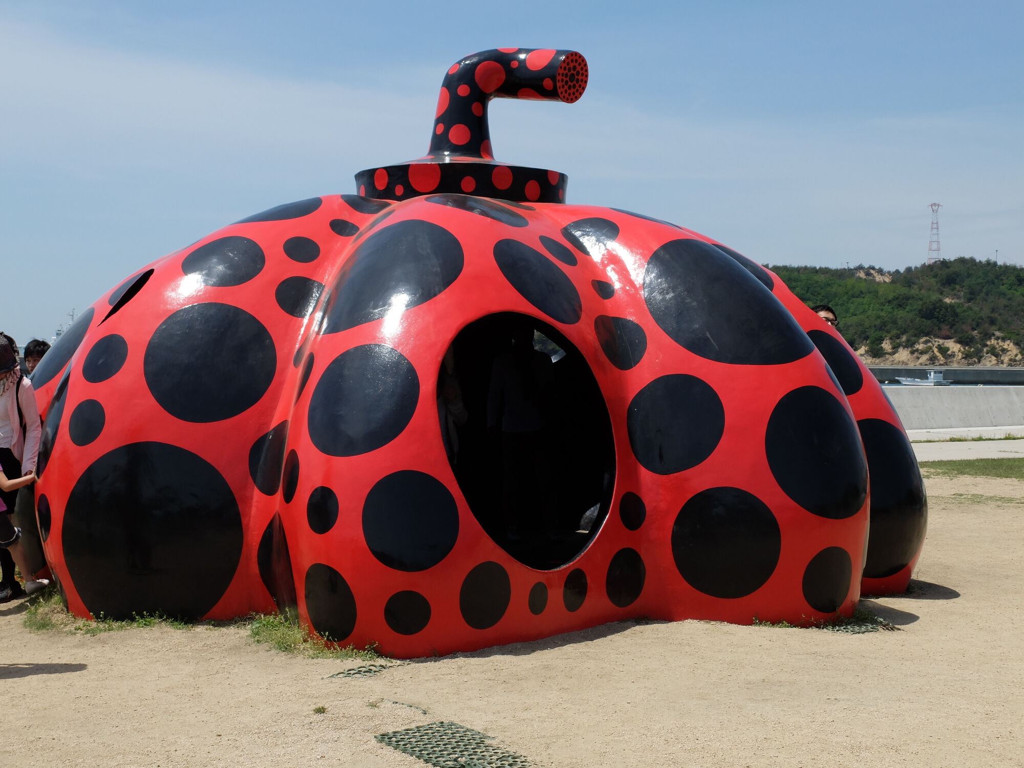 Dann musste mal wieder Kultur her und wir brachen früh zur Museumsinsel Naoshima auf. Das Wetter war super und wir erwischten sogleich eine Fähre für die Überfahrt. Die Insel war dann eine Überraschung. Ein Foto hatte zuvor unsere Phantasie beflügelt. Wir hatten uns eine Art Sandbank mit Kunst-Installationen darauf vorgestellt, die Idee der Insel ist aber eine andere: Man hat auf einer normal bewohnten Insel quasi zur Strukturförderung soviel Kunst angesiedelt, bis sie zur „Museumsinsel“ wurde. Die von Künstlern umgestalteten Häuser und Räume mit ihren Installationen waren allesamt interessant. Jedoch brauchte man für fast alles Tickets, für manches, z.B. die Museen noch Extratickets, die man im Morgengrauen kauft – nicht unsere Stärke.