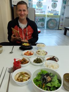 Zurück in Andong gingen wir in einem veganen Restaurant essen. Hier gab es typisch koreanische Kost und so konnten wir frei und fröhlich Bibimbap und Kimchi probieren. Wie wir feststellten, gehört das Restaurant zu einer von einem Guru geleiteten Restaurant-Kette.
