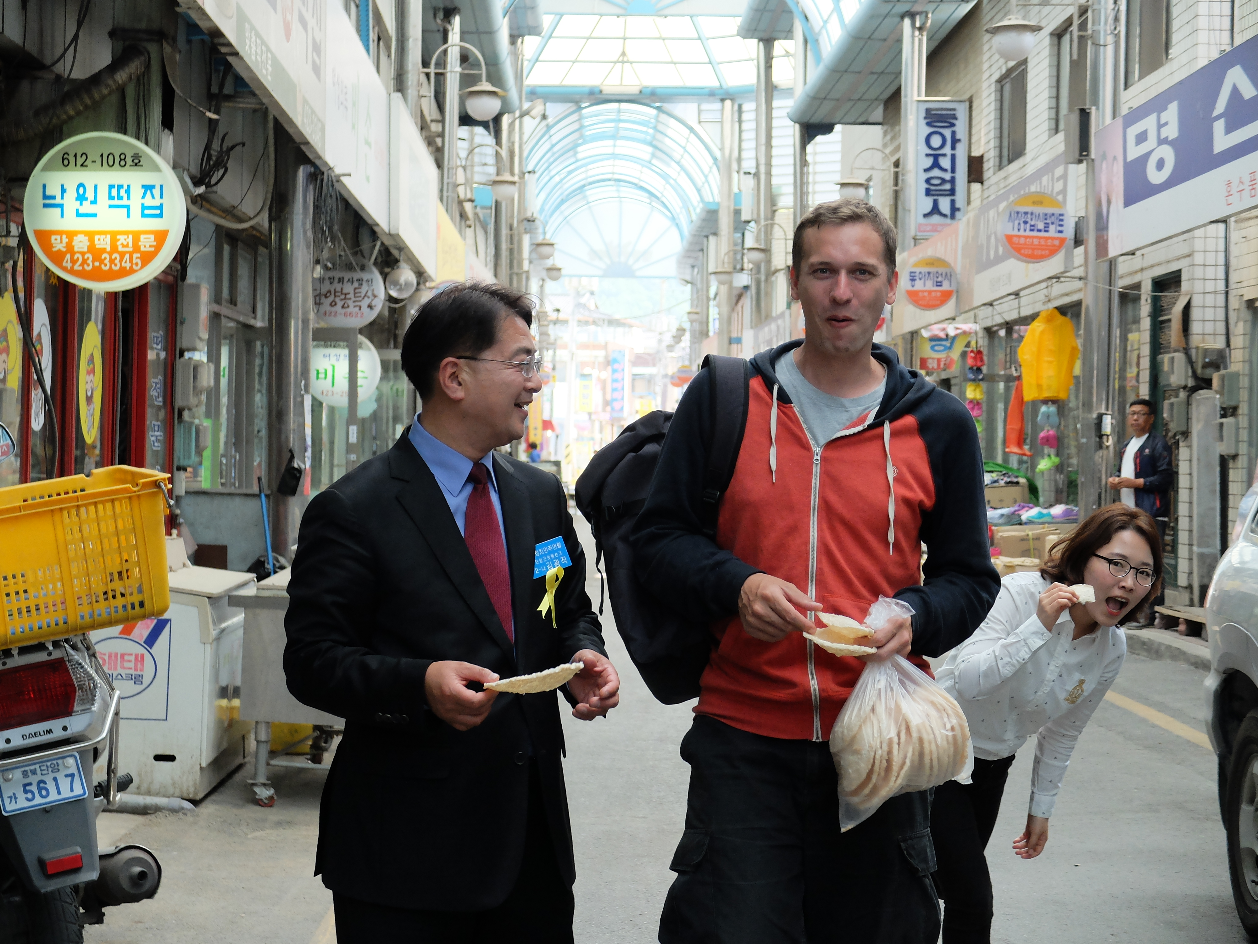 Von Andong nahmen wir diesmal den Zug und fuhren nach Danyang. Wir hatten uns in einem Guesthouse eingebucht, in dem wir mit besonders offenen Armen empfangen wurden. Die besonderen Note lag darin, dass unser Gastgeber für das Bürgermeisteramt kandidierte und er ausländische Gäste gut gebrauchen konnte, um für sich Werbung zu machen. Wir bekamen nach einem kurzen Stop im Wahlkampfbüro eine Führung über den Markt, begrüßten alle wichtigen Standinhaberinnen uns Standinhaber, und gingen zusammen Essen. Sein Bruder, ein Schneider, lachte, als er uns zusammen sah. Er bat uns in sein Geschäft, während er seinem Bruder etwas zurief. Ich fragte, was er da zu ihm gesagt hätte und er meinte auf englisch: You make him look smart.