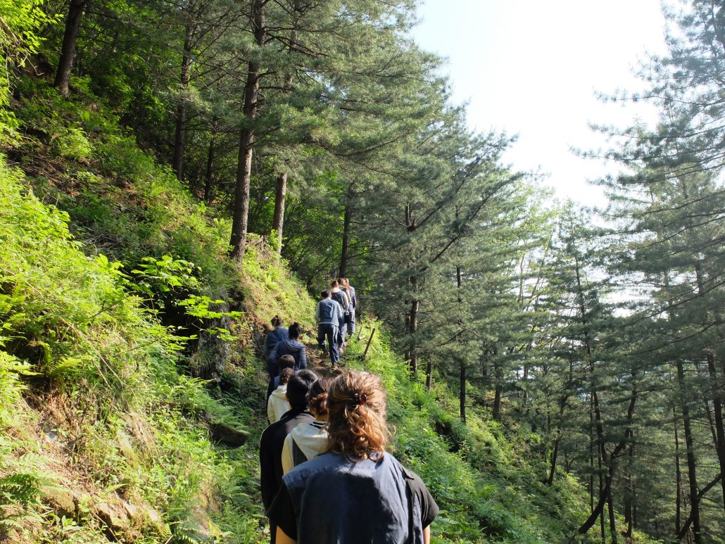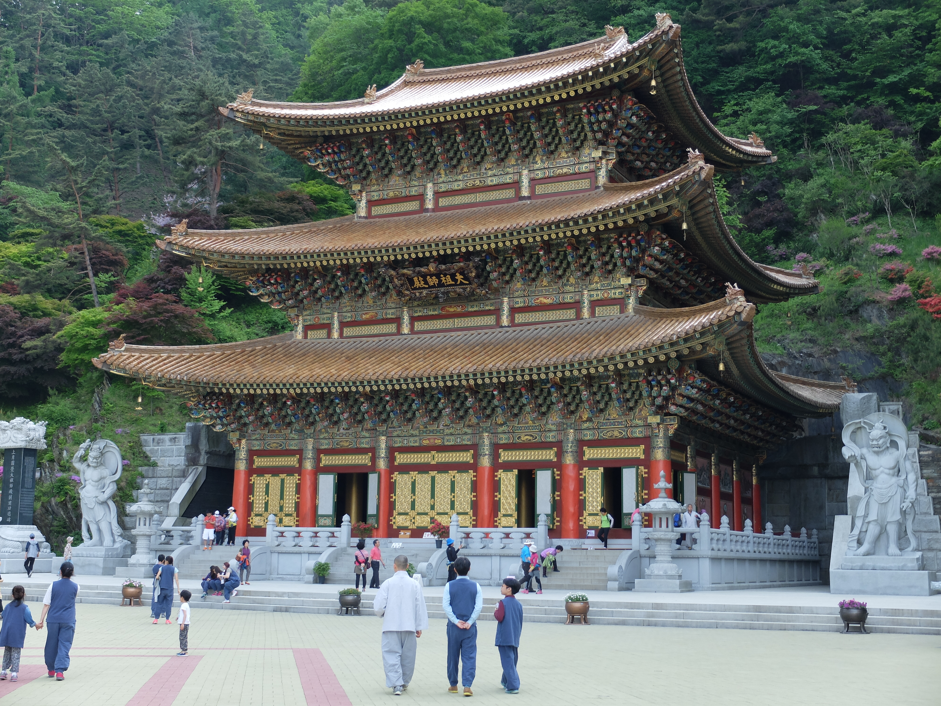 Wir checkten ein und lernten unsere Gruppe kennen. Sie bestand aus jungen amerikanischen Erwachsenen, die für ein Jahr als Englischlehrer in Korea arbeiten und Koreanern, die sich für den Buddhismus interessieren. Wir zogen unsere Uniformen an und machten eine Besichtigungstour durch das Kloster. Es gab zum Abend ein einfaches Essen, dessen Zutaten die Mönche und Nonnen selbst anbauen. Bei der Abgabe des Tabletts wird darauf geachtet, dass alles, was man sich genommen hat, aufgegessen ist. Wenn nicht, dann wird nachgesessen oder der Nachbar hilft. Kein Pardon. Anschließend übten wir in der Dharma Hall das Verbeugen und den Mediatationsreim. Vor dem zu Bett gehen gab es Tee und Konversation mit einer Nonne, alles sehr interessant. Geschlafen wurde ortstypisch (wie in Japan nur härter, aber dafür wärmer, weil der Boden beheizt ist, manchmal). Am nächsten Tag standen wir um 3 Uhr Morgens auf, um zu meditieren. Anschließend konnte man noch mal eine Runde schlafen oder selbständig das Allerheiligste erklimmen. Wir entschlossen uns für das Nirvana, stiegen viele Stufen hoch und haben es nicht bereut. Am nachmittag stand ein gemeinsamer Meditationsspaziergang an. Es ging die Berge entlang auf schmalen Pfaden, hin zu einer surrealen Graskuppel, auf der wir meditierten und staunten. Das Grün zu unseren Füßen fiel einfach ins Tal, ohne Klippe, ohne Kante.