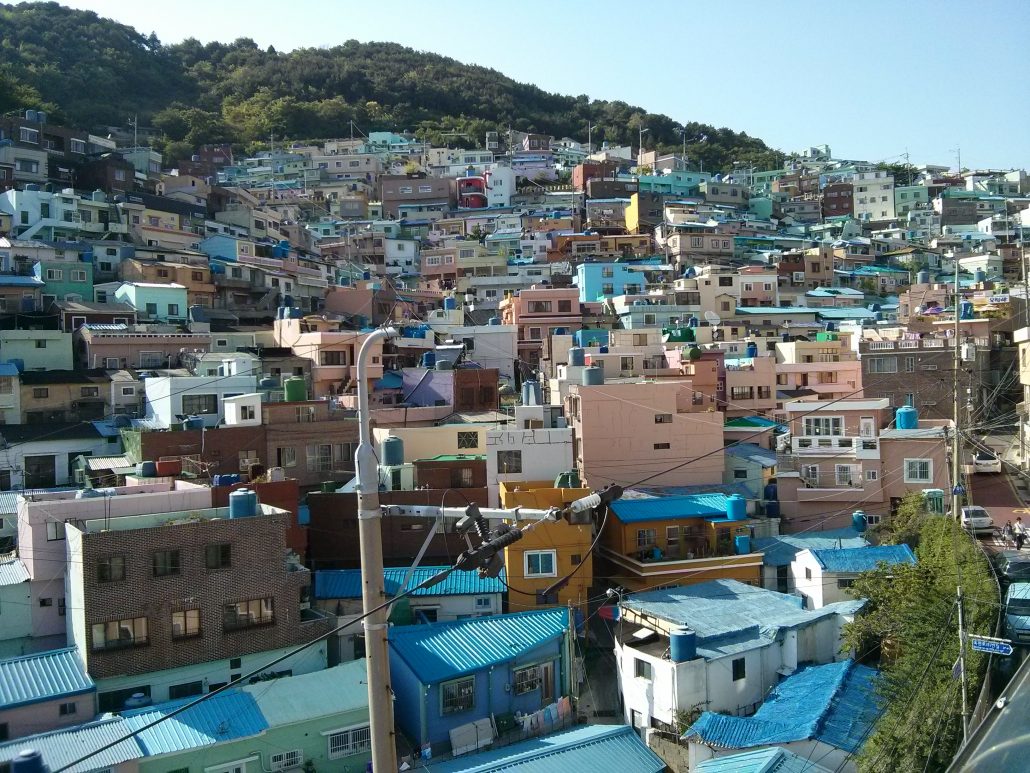 Statt Telefonkartenshophopping stand Gamcheon auf unserer langen Wunschliste für unsere kurze Zeit in Busan. Gamcheon wurde im Koreakrieg von Flüchtlingen gegründet und ist jetzt als Art Village bekannt. Das ging so: Um ihre schwierige Situation zu verbessern, haben die Einwohner vor ein paar Jahren angefangen, Häuser und Wege in Kunsträume und Treffpunkte zu verwandeln. In einigen der bunten Häuser gibt es jetzt interessante Installationen zu sehen, in den Straßen entdeckt man immer wieder große Gemälde und kleine Details. Ein erfolgreiches Projekt, aber die Besucherströme haben auch ihre Folgen. Nicht jeder Einwohner dürfte sich darüber freuen, dass lautstarke Touristen hinter der Gardine eine Kunstinstallation wittern.